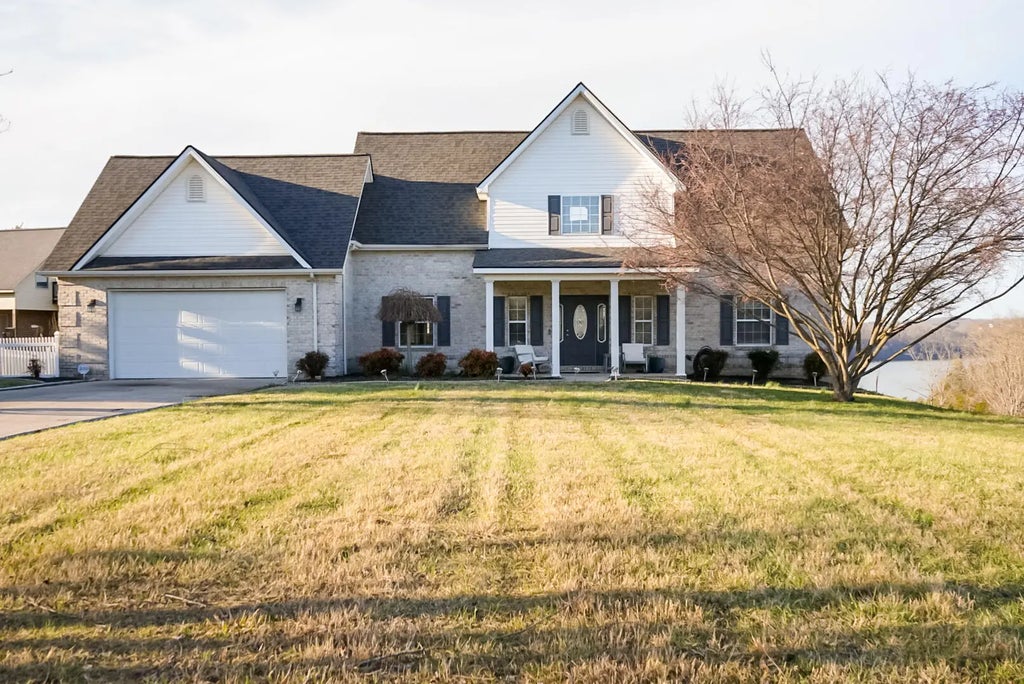 This charming, one-owner home offers a perfect blend of comfort and functionality, featuring 3 bedrooms, a spacious bonus room above the garage, and 2.5 baths. The inviting kitchen boasts an island with bar seating, complemented by a separate dining area for more formal gatherings. The primary suite, located on the first floor, includes a private en suite bath with a relaxing jetted tub and a separate shower. The living room impresses with soaring two-story windows that flood the space with natural light and provide stunning views of the backyard and Lake Cumberland. A stair lift is installed for added convenience but can be easily removed if not needed. Upstairs, you'll find two additional bedrooms, a cozy sitting area, and the versatile bonus room. A full bath with a tub-shower combination serves this level. Step outside to enjoy the expansive, multi-level deck—perfect for entertaining or simply soaking in the serene surroundings. The fenced dog run adds convenience for pet owners. Nestled on a peaceful 0.63-acre lot at the end of a quiet street, this home offers both privacy and a prime location.