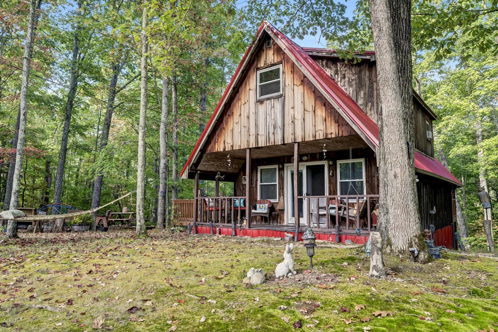 This cabin is ideally located only 1.5 miles from Long Bow Marina on Cave Run Lake and only 35 minutes to hiking and rock climbing at the Red River Gorge. This charming rustic cabin offers cozy comfort on a serene property made up of three, half acre lots, for a total of 1.46 acres of land. This cabin previously has been updated throughout with white pine interior walls downstairs, updated kitchen with pine cabinetry, newer countertops, tile back splash, stainless appliances, washer and dryer is included in the laundry room area under the cabin. This cabin features two inviting bedrooms upstairs and a full bath upstairs that has been updated with tile flooring and new vanity, and a half bath downstairs for your convenience. This cabin comes partially furnished and upstairs has a screened in private back deck off the bedroom to relax in. Enjoy the comfort of central heat and air and also a wood burning wood stove in the kitchen/dining area for a crackling fire ambiance. Unwind in the private hot tub, nestled among the trees, or gather around the outdoor firepit for evening relation. The detached 12 x 24 Amish built garage has electric and provides ample space for your vehicle, boat storage, or outdoor gear. Whether your looking to escape or entertain, this cabin delivers tranquility and rustic charm in a beautiful natural setting.