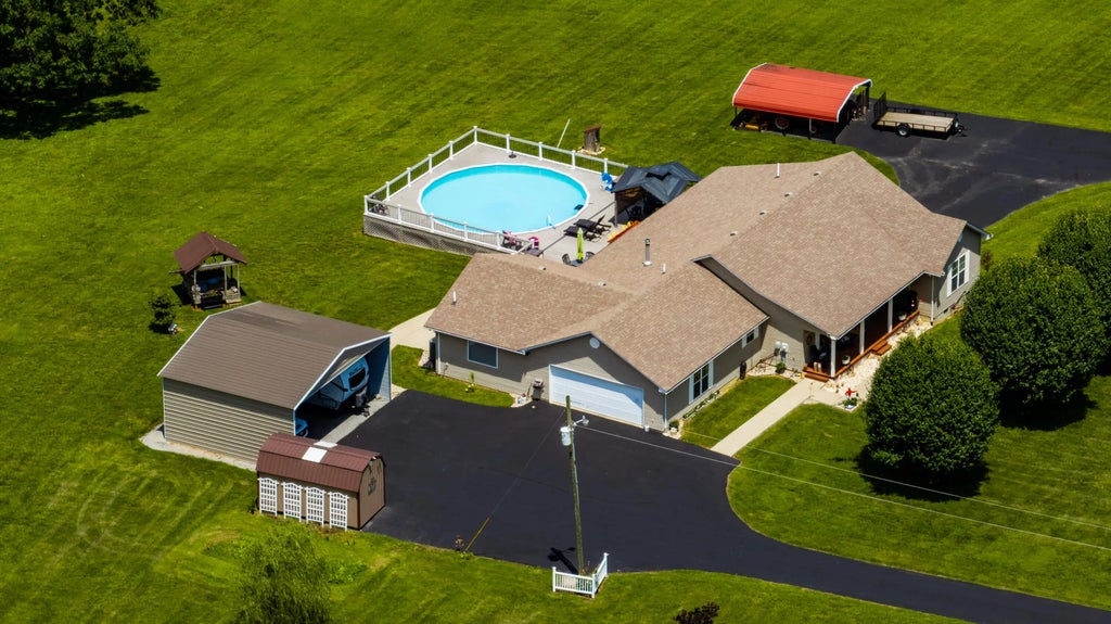 Beautiful custom sprawling ranch home with 4,312 sq ft of living area and sitting on 9.6 unrestricted acres! All this within 5 minutes of Jamestown Marina or Pleasant Hill Marina! This open concept home has 4 bedrooms, 4.5 baths, large open kitchen, living room and dining area overlooking the beautiful - partially covered back deck with a 30 ft by 52 inch pool that makes a beautiful outdoor oasis! The composite decking makes for easy maintenance. The primary bedroom is large and luxurious with a soaking tub and shower. It has double doors walking out to the back deck. There is 2nd bedroom that could be used a guest suite that also walks out to the deck and has it's own bathroom! The first floor has 2 other bedrooms with a jack & jill bath. The basement is open concept with a full bath, washer and dryer, kitchen area, family room space and space for more sleeping arrangements. There is a garage door and a man door in the basement. This home has 2 driveways, a 25x30 carport, 20x18 carport and 6x18 shed. This home is a RARE FIND in Lake Cumberland, it checks all the boxes, even location! It also has a wood stove tied to the air ducts for emergency heat. HURRY HURRY ON THIS ONE