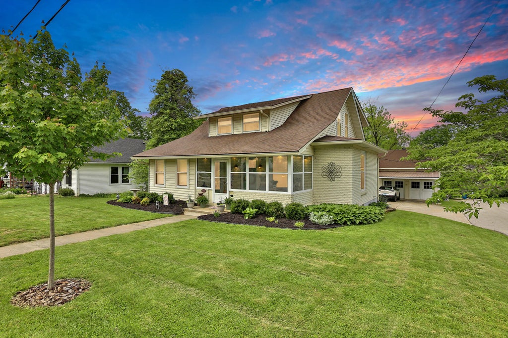 Located in a quiet, established neighborhood near downtown Shelbyville. This Well-Kept Craftsman Style Bungalow is Full of warmth & character, the home features hardwood floors, crown molding, brick fireplace, & a stunning kitchen w/quartz counters, bar area, updated appliances, & a stylish backsplash! Enjoy a cozy sunroom, formal dining room, & powder room on the main level. Just off Main Street in Shelbyville, this beautifully updated 2-story home offers 2,274 sq ft of finished living space, & a 1st-FLOOR PRIMARY bedroom w/walk-in closet & full primary bath. The detached garage w/lg carport has a 364 sq ft Guest House w/separate entrance & separate parking! Upstairs bedrooms include built-in closets & shelving, w/a charming vintage-style full bath. The partially finished basement offers a walk-up door to the backyard, & the oversized deck w/custom sunburst railings overlooks a tree-lined double lot, perfect for relaxing or entertaining. This warm, inviting home exudes timeless charm and is a MUST-SEE!