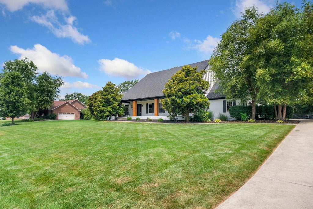 Set on one of the most scenic lots in Jessamine County, this impeccably maintained 5-bedroom, 3-bath home blends location, comfort, and nature's beauty. A welcoming front porch framed by mature trees invites you inside, where you'll find an expansive living room, dining room, and eat-in kitchen. This home showcases quality craftsmanship with beautiful hardwood floors, quartz countertops, and a convenient main-level primary suite that opens directly to the back patio with hot tub. An additional guest bedroom and full bath are also located on the first floor. A three-car garage and multiple attic accesses provide ample storage and convenience. The second level features three spacious bedrooms and a Jack-and-Jill bath. The fenced backyard boasts a fire pit, lush landscaping, and private steps down to Hickman Creek—a peaceful spot for nature watching, occasional wading, or even kayaking. Enjoy coffee on the patio, evenings stargazing from the hot tub, and relaxing weekends outdoors. Located 1 mi from the new 27 Bypass, 1.5 mi from the future Parks & Rec Center, & minutes to shops & dining-this property is in a class of its own!