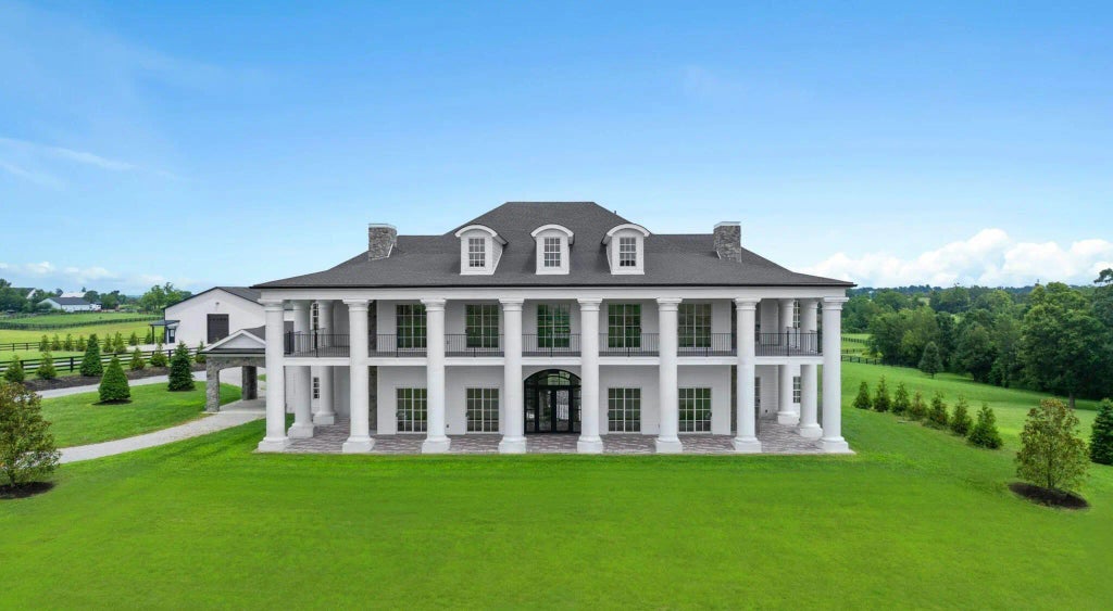 Experience the best of Kentucky living at La Vista Estate, a striking brand-new custom colonial set on over 27 rolling acres along the coveted Iron Works Road, in the heart of Bourbon County horse country. Designed to impress, this newly constructed home pairs timeless architectural details with modern amenities, all surrounded by panoramic views of the Bluegrass countryside. A floating spiral staircase under a domed ceiling welcomes you into a grand interior featuring wide plank French oak floors, soaring coffered ceilings, and extensive custom millwork. The chef's kitchen is outfitted with Wolf, Sub-Zero, and Cove appliances, Calcutta Izaro quartz countertops, a large island, and a spacious butler's pantry. Step outside to enjoy the covered outdoor kitchen with granite counters and a stacked stone fireplace, along with multiple verandas designed for relaxing and taking in the views. The main level also includes a stately study, formal dining room, grand great room with wet bar, expansive living room, laundry room, and four fireplaces. The main-level primary suite offers a spa-like ensuite bath, a makeup room, and dual walk-in closets. Upstairs, a second primary suite, four additional bedrooms, a spacious den (living room aka helm) with a fireplace, and four bathrooms provide generous space and flexibility. The third level features a truss-beamed theatre room, a bonus room, and a half bath. The home is elevator-ready with a built-in shaft in place and wired for a whole-house generator. Perched above the oversized garage, featuring six doors and space for up to 12 vehicles, the guest house includes two bedrooms, two full baths, a den, and a full kitchen. With over 950 feet of road frontage, the property also includes a 4-stall insulated barn with a tractor bay, a 60' x 80' barn with two 16' garage doors, a fully fenced perimeter, and a 673-square-foot tenant house with an RV hookup. Located just 15 minutes from Lexington, Paris, and Winchester, this estate offers high-speed internet, public water, and integrated Google Smart Home systems. EVADI Horse Farm borders the property and offers training and convenient boarding. An additional 150-acre tract, situated just two miles down the road, is also available for purchase.