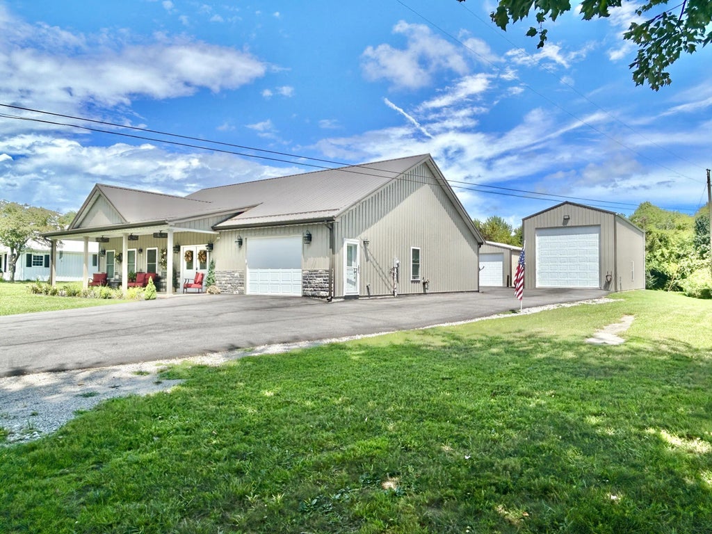Experience the perfect blend of rustic charm and modern comfort in this stunning 3-bedroom, 2-bath barndominium, set on a generous half-acre lot just minutes from town. Boasting 2,392 sq. ft. of thoughtfully designed living space, this home features an open concept layout with expansive living and dining areas—ideal for relaxing or entertaining. The kitchen is a chef's dream, complete with custom white cabinetry, granite countertops, stainless steel appliances, a farmhouse sink, and a massive island with a built-in pop-up outlet. Retreat to the primary suite, where you'll find two spacious walk-in closets and a luxurious bathroom offering double vanities, an oversized tiled walk-in shower, and a generous linen closet. Step outside to a covered back patio, perfect for enjoying peaceful evenings or gatherings with friends and family. Car enthusiasts and adventurers alike will appreciate the incredible garage spaces: a 20x50 RV garage with a 16 ft door, 110 and 220 electric, plus washer/dryer hookups; and an additional 40x30 detached garage, also with 110 and 220 electric. All this, set in a desirable location super close to town—this home truly has it all!