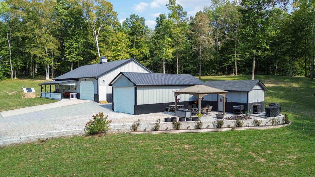 Discover this incredible barndominium-style retreat nestled on 2.43 secluded acres just minutes from Lake Cumberland! Built in 2016 and meticulously maintained, this home is truly move-in ready and designed for comfort, convenience, and a laid-back lifestyle. Located off a quiet paved blacktop road with very little traffic, you'll enjoy the perfect balance of privacy and accessibility. The 2-bedroom, 2-bathroom home offers 1,368 square feet of finished living space with an open and inviting layout. The spacious 2 car attached garage is a showstopper—heated and cooled, with epoxy flooring, built-in shelving, and a 10x24 floored attic plus another 11x36 floored storage area that spans across the house. There's room for vehicles, boats, hobbies, or even a workshop, making it as versatile as it is impressive. Step outside and fall in love with the outdoor amenities. Relax on the covered front porch, gather around the firepit, or spend the afternoon under the gazebo surrounded by nature. A garden space is ready for planting, and for peace of mind, there's a cement in-ground storm shelter. A detached 16x36 boat garage—insulated, with electric and a concrete floor—plus a 12x20 garden shed provide even more space for all your outdoor gear, tools, and toys. To top it off, the home comes equipped with a Generac generator that powers nearly everything you need, so you're always prepared. The sellers have thoughtfully furnished this home and are leaving it completely stocked and ready to enjoy from day one. Conveying items include all kitchen appliances, washer and dryer, ice chest freezer in the detached garage, couches, beds, TVs, tables, small kitchen appliances, utensils, dishes, linens, and more. Outdoor living is also turnkey, with a Pit Boss smoker, 5-burner grill, Blackstone, outdoor cooler, and outdoor furniture all included. It's the perfect setup for entertaining or relaxing after a day on the lake. The bedrooms are beautifully appointed, with the primary featuring a King Sleep Number bed and the second offering two queen beds—perfect for family or guests. Whether you're looking for a permanent residence, a fully stocked Airbnb ready to go, or a vacation home where you can instantly relax and unwind, this property is ready for you. Conveniently located just 1-3 miles from multiple boat ramps and only 6 miles to Wolf Creek Marina, you'll love the easy access to Lake Cumberland's boating, fishing, and recreation. This property truly checks all the boxes—not only for lake life living, but also for those looking to retire in comfort, anyone wanting to enjoy a slower pace in the country away from the hustle and bustle, or buyers searching for a home that's easy to care for with space to grow. There's room for a garden, room to build another home, or even space to add a camper hookup for visiting guests. Whether you're seeking adventure, relaxation, or both, this meticulously cared-for property offers everything you need in one remarkable package.