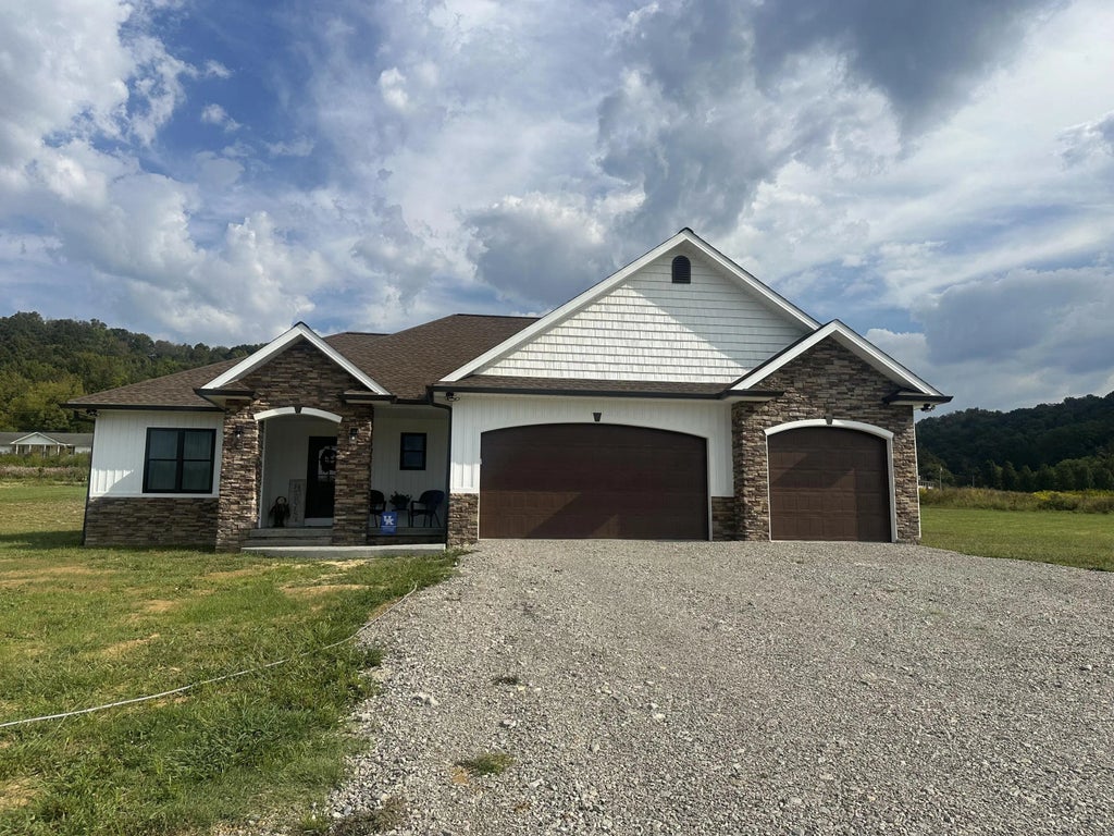Step into this remarkable new construction home where exceptional curb appeal greets you with custom stonework, stamped concrete walkways, wooden stained posts, and beautifully designed garage doors. This thoughtfully designed residence features an open floor plan concept that maximizes natural light throughout the living spaces, highlighted by a full mantle fireplace and soaring vaulted ceilings in the living room. The user-friendly kitchen serves as the heart of the home, showcasing an island sink, soft-close cabinets, and elegant granite countertops. Flow seamlessly from the kitchen to the dining room, which opens to a covered back porch complete with stamped concrete flooring - perfect for entertaining or quiet relaxation. The home's practical layout places two guest bedrooms at one end, separated by a well-appointed guest bathroom featuring quality fixtures and finishes. Double doors reveal the spacious primary bedroom suite at the opposite end, offering a true retreat with its generous proportions. The primary bathroom provides luxury with a jetted garden tub and an impressive forty-eight inch ceramic tile walk-in shower, complemented by dual vanities with granite countertops and an exceptionally large walk-in closet. Additional conveniences include an attached three-car garage accessible from the kitchen, complete with pull-down attic storage. The property features flat, usable land with city water, fiber optic internet service, and a private septic system. A prefab storage building provides extra utility space. Located just minutes from Burkesville's welcoming community atmosphere, the Cumberland River, and Dale Hollow Lake, with convenient access to the Cumberland Parkway and Columbia's Lindsey Wilson College approximately twenty minutes away, this home offers both tranquility and connectivity.