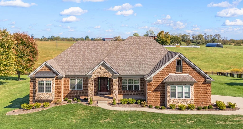 This showstopper custom ranch on a full finished basement was designed for comfort, style, and space for all. Featuring 5BR/3.5BA's, this home is the perfect mix of open-concept living with thoughtful details throughout. The main level welcomes you with a foyer, formal dining room, private office, and a great room with vaulted ceiling and gas log fireplace. The open kitchen offers granite countertops, stainless steel appliances, and a spacious breakfast bay overlooking picturesque farmland. The split-bedroom layout provides a private owner's suite with a huge walk-in closet and spa-like bath, plus two additional bedrooms with a shared Jack-and-Jill bath. The main floor also features a spacious utility room with ample cabinetry and a utility sink. The finished basement is perfect for multigenerational living or entertaining, complete with updated laminate flooring, a large kitchenette, open recreation area, theater or family room space, bonus room, two additional well-proportioned bedrooms, storage, and an auxiliary garage for lawn equipment or hobbies. Outdoor living shines here with a covered back deck, patio, basketball court, and a partially fenced one-acre yard. Additional features include a side-entry two-car garage, covered front porch, hardwood floors, 2025 updated carpet and paint, 2023 roof shingles, and a tankless gas water heater for an endless supply of instant hot water.