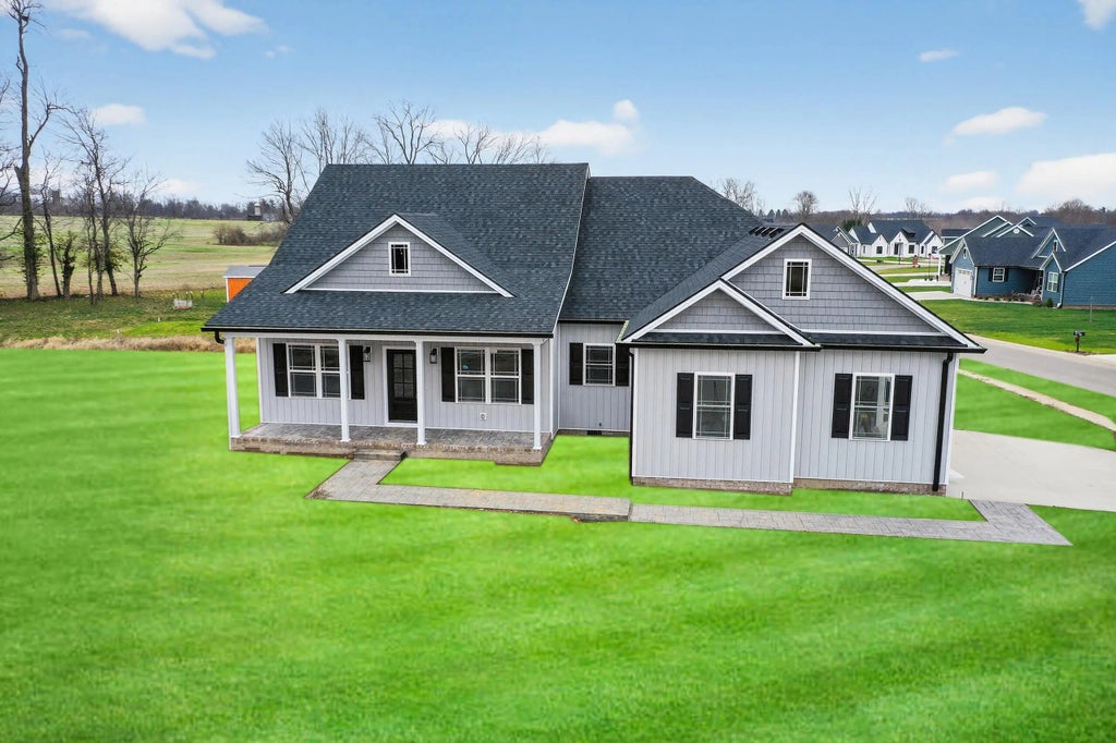 Discover the inspiring blend of modern design in a serene cul-de-sac setting. This board and batten style, new construction home offers 3 bdrms., 2 baths and is nearing completion. Charming features include dormers with windows, a tongue and groove porch ceiling, and stamped concrete. A stylish 6-pane door opens into the great room with a modified open floor plan that blends openness with defined living spaces. A wide casement opening connects the great room and kitchen, offering an airy feeling while each room has its own character. The main living space features a 9' ceiling, a tray ceiling and luxury vinyl plank flooring. The sun-filled kitchen offers Shaker-style cabinets with crown molding, a large island for gatherings, quartz countertops, a tiled backsplash, stainless steel appliances, and a handy pantry. The primary suite offers comfort and sophistication with a tray ceiling, a large walk-in closet and an additional closet. The luxurious bath features a soaking tub, a dual sink, granite top vanity, and a tiled step-in shower. A valuable flex room is located across the hall, which would be an ideal nursery, office or workout room. The thoughtful layout offers a spacious and bright laundry room. The split floor plan offers two more bedrooms with a large hall bath featuring a granite top vanity and a step-in shower. You will really appreciate the appealing design of this home's side-entry garage featuring an 18' door. The pull-down attic features a floored, lit storage space with windows offering approx. 275 sqft to organize your holiday items. Imagine your morning coffee or evening relaxing on the private rear porch offering a farmland view. Consider the wonderful benefits this home offers, built by Barnett Construction, an experienced, trusted builder in the desirable Shelby Greene neighborhood. Please note, grass is AI generated.
